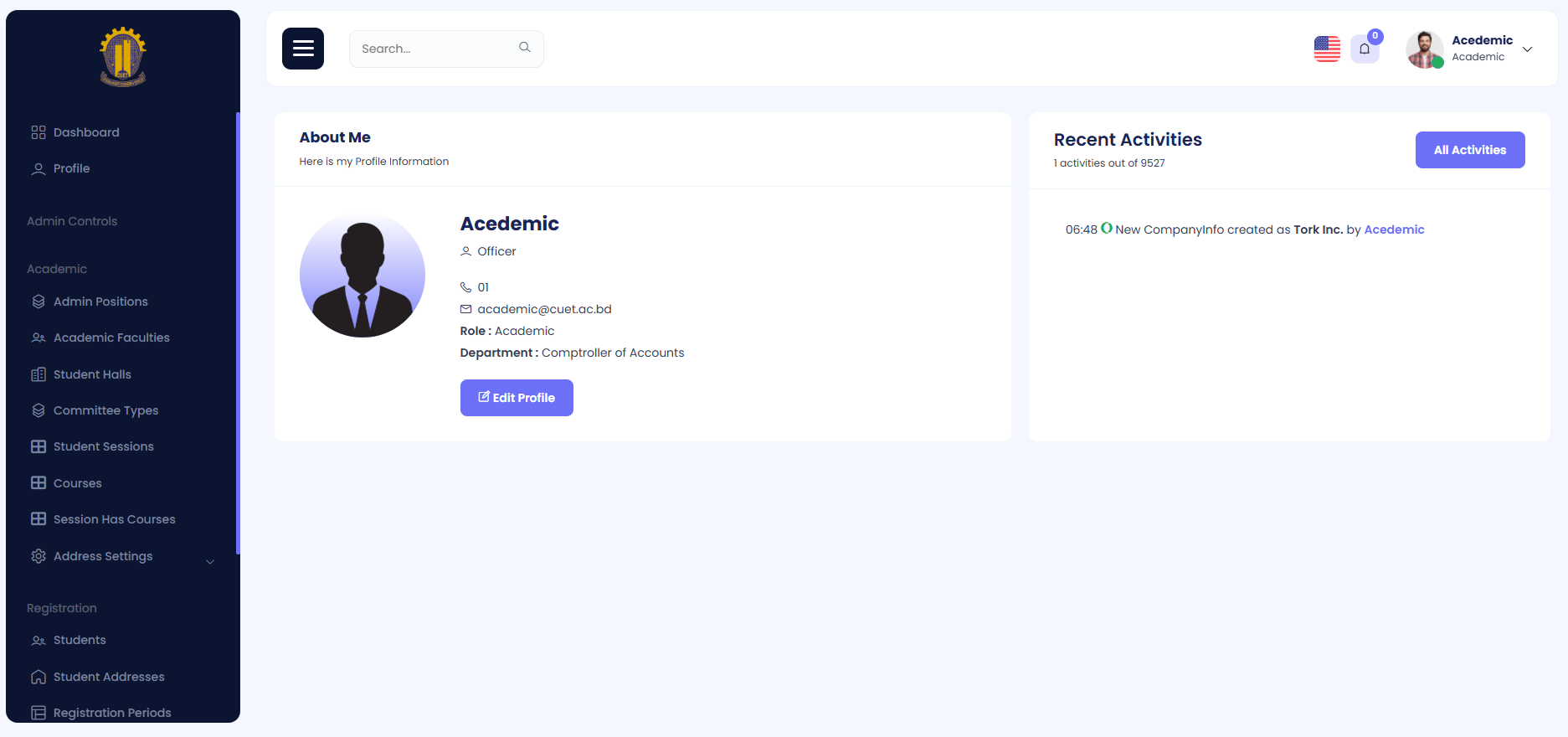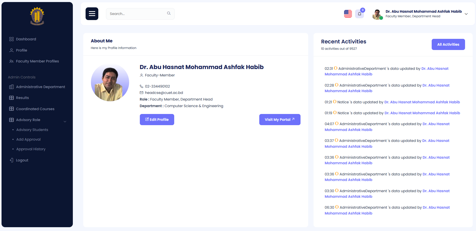 The Faculty Member Profile module allows administrators to manage faculty member details, including their administrative roles, personal contact information, and activity status. You can view, add, edit, activate/deactivate, and manage faculty member profiles as needed.